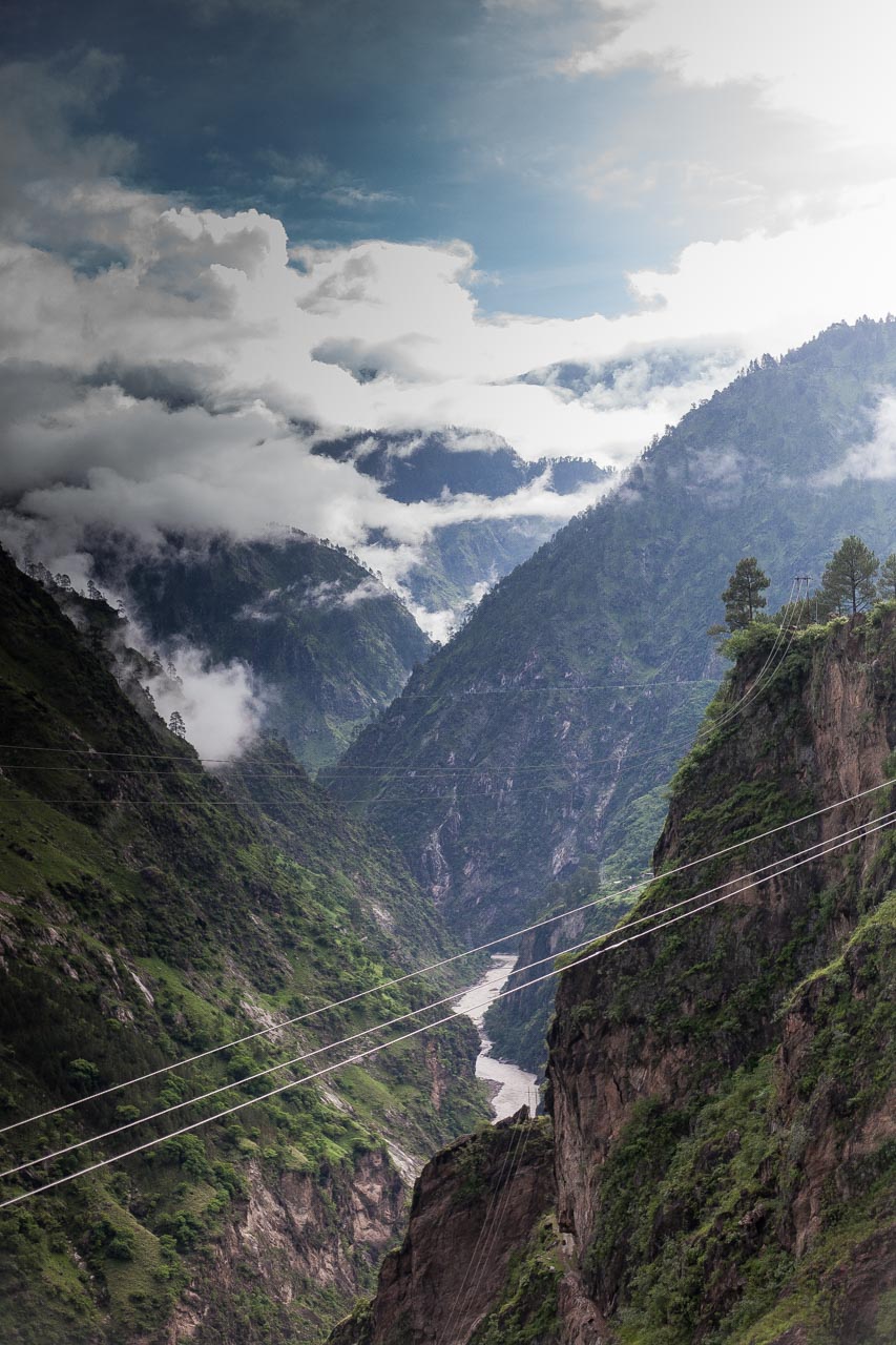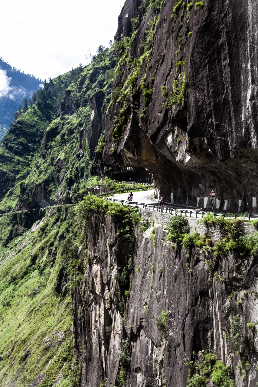 Die Sonne hat sich gegen den Regen durchgesetzt. es sind angenehme 28 Grad. Auf der linken Seite, einige hundert Meter unter uns schlängelt sich der Fluss und wir folgen den hundertfachen Kurven des Straßenverlaufs. Besonders spektakulär sind die tunnelartigen Passagen, bei denen die Strasse in den Felsen gehauen wurde. Auf diesen Höhen von sind die Gebirgshänge noch grün bewachsen und wir swingen uns entlang der Felswände immer weiter in Richtung Tibet. Es gibt wirklich schlechtere Arbeitstage.